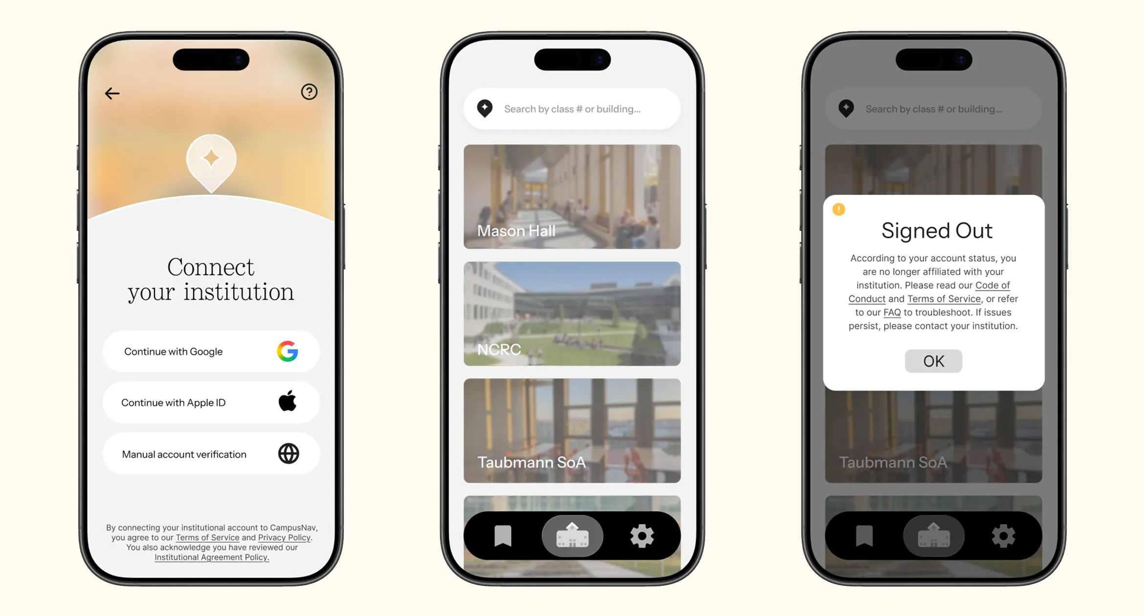 Left to Right: Login, Class/Building Search, Account Security Error (campus security assurance feature)